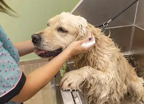 皮膚に優しいシャンプーを使用して、体全体の汚れや被毛の油を落とします。